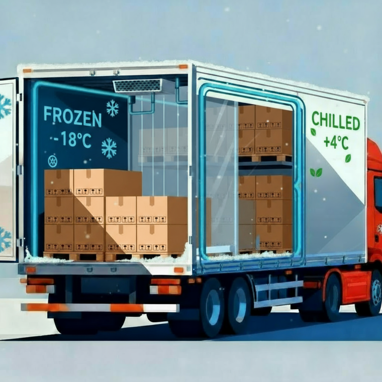Oferujemy transport chłodniami w systemie bi-temp. Oznacza to możliwość transportowania na jednej chłodni towarów w dwóch niezależnych temperaturach (nawet możliwe jest jednoczesne transportowanie towaru mrożonego i chłodzonego). Chłodnia wyposażona jest w dwa niezależne agregaty.